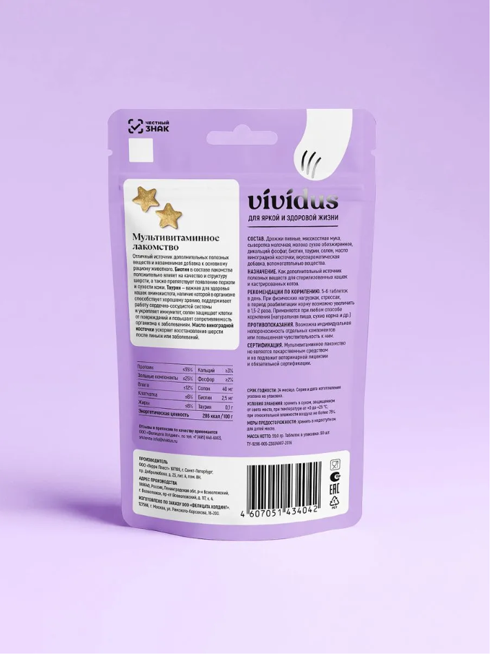 Здоровые кошки Мультивитаминное лакомство – отличный источник дополнительных полезных веществ и незаменимая добавка к основному рациону животного. Биотин в составе лакомства положительно влияет на качество и структуру шерсти, а также препятствует появлению перхоти и сухости кожи. Таурин – важная для здоровья кошек аминокислота, наличие которой в организме способствует хорошему зрению, поддерживает работу сердечно-сосудистой системы и укрепляет иммунитет, селен защищает клетки от повреждений и повышает сопротивляемость организма к заболеваниям. Масло виноградной косточки ускоряет восстановление шерсти после линьки или заболеваний. Уникальный состав для здоровья Биотин — улучшает структуру шерсти, предотвращает сухость кожи и перхоть. Масло виноградной косточки — ускоряет рост шерсти после линьки и заболеваний. Таурин — незаменимая аминокислота для зрения, сердца и иммунитета. Селен — защищает клетки от повреждений, укрепляет иммунитет. Удобство применения Подходит для любого способа кормления (натуральная пища, сухие корма и др.). Рекомендуемая норма — всего 5−6 таблеток в день, с возможностью увеличения дозы при нагрузках или стрессе. Форма таблеток-лакомств упрощает приём и повышает привлекательность для питомца. Пищевая ценность Содержит оптимальное количество протеина (35%), витаминов и минералов. Энергетическая ценность — 288 ккал/100 г, что соответствует потребностям активных животных. Комплексная поддержка организма Способствует укреплению иммунитета и улучшению общего состояния. Положительно влияет на внешний вид, работоспособность и качество жизни питомца. Подходит для профилактики заболеваний и поддержки в период реабилитации. С заботой Vividus заботится о здоровье и счастье ваших любимцев. Наши лакомства — это идеальный способ показать свою любовь и заботу о кошке. Подробнее