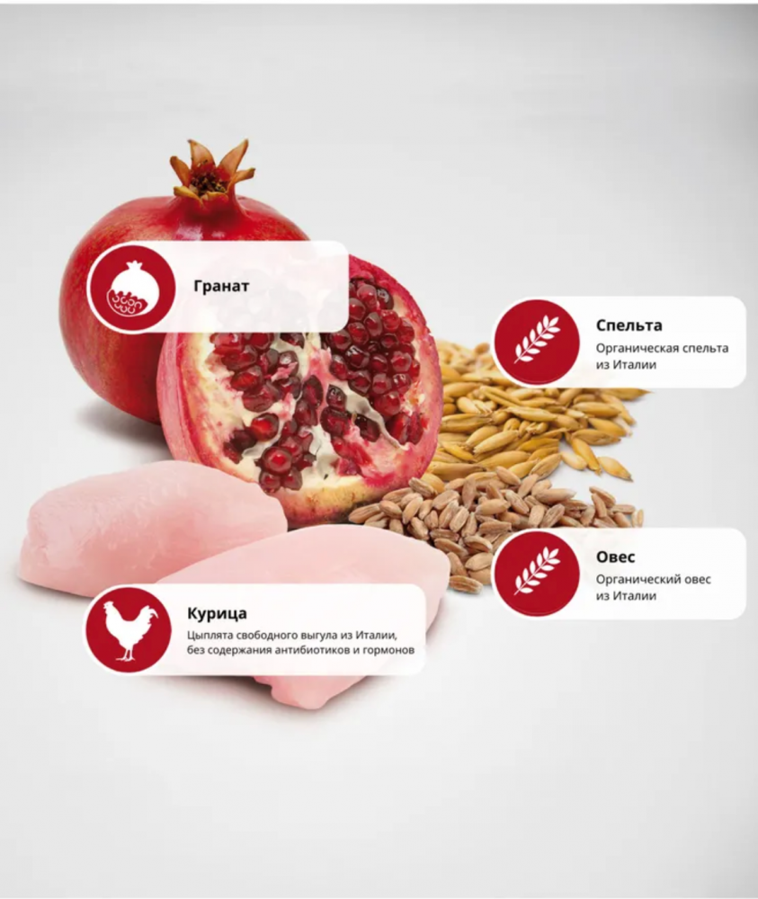 Ингредиенты: свежее куриное филе (30%), дегидратированное куриное мясо (28%), картофель, куриный жир, дегидратированные цельные яйца, свежая сельдь, дегидратированная сельдь, рыбий жир, гидролизат животного белка, волокна гороха, сушеная морковь, сушеная люцерна, инулин, фруктоолигосахариды, маннанолигосахариды, порошок граната (0,5%), сушеные яблоки, порошок шпината, подорожник (0,3%), порошок черной смородины, дегидратированный сладкий апельсин, порошок черники, хлорид натрия, сухие пивные дрожжи, корень куркумы (0,2%), глюкозамин, хондроитинсульфат, экстракт календулы (источник лютеина).