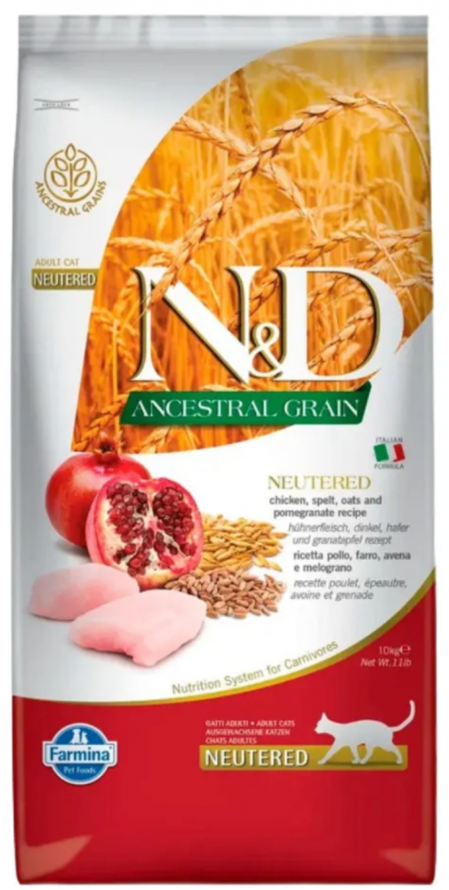 Farmina N&D CAT Chicken & Pomegranate Adult Фармина Курица с гранатом - полнорационный беззерновой корм для взрослых стерилизованных кошек и кастированных котов Линейка Natural&Delicious (N&D) производства итальянской компании Farmina Pet Foods преимущественно из итальянских ингредиентов. Почему БЕЗЗЕРНОВОЙ? Эволюционно и собаки, и кошки - это хищники, их анатомия