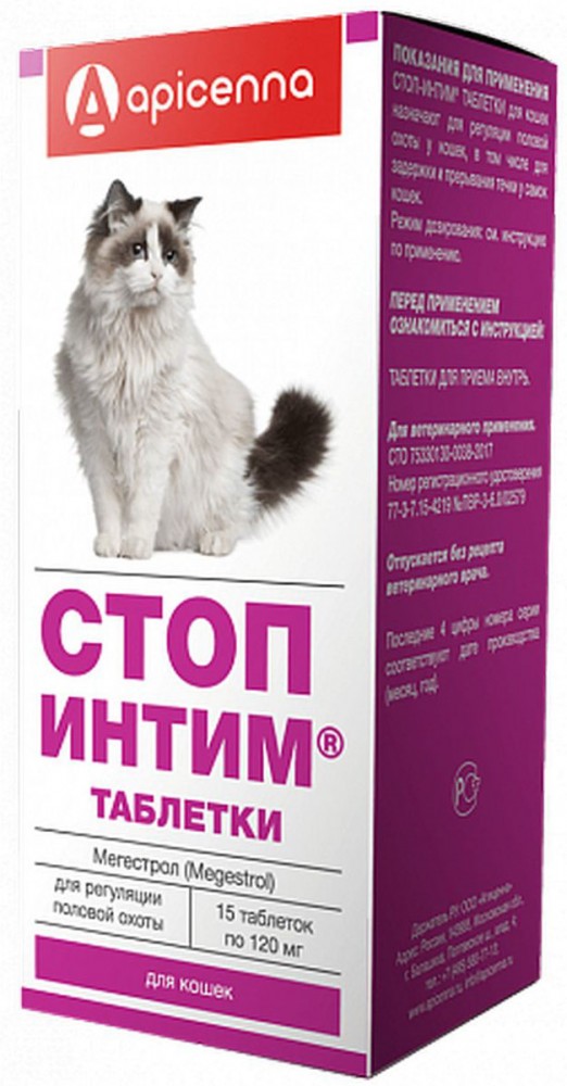 Стоп-Интим таблетки для кошек назначают для регуляции половой охоты у кошек, в том числе для задержки и прерывания течки у самок кошек, снижения половой активности и коррекции поведения у котов. Противопоказанием к применению Стоп-Интим таблеток для кошек является повышенная индивидуальная чувствительность животного к компонентам препарата (в том числе в анамнезе), заболевания мочеполовой системы, опухоли и диабет.