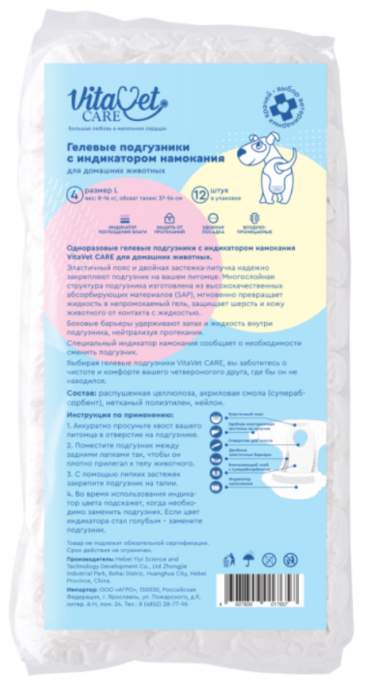 Эластичный пояс и двойная застежка-липучка надежно закрепляют подгузник на вашем питомце. Многослойная структура подгузника, изготовленная из высококачественных абсорбирующих материалов, мгновенно превращает жидкость в непромокаемый гель, защищает шерсть и кожу животного от контакта с жидкостью. Боковые барьеры удерживают запах и жидкость внутри подгузник. Специальный индикатор намокания сообщает о необходимости сменить подгузник. Выбирая гелевые подгузники VitaVet CARE, вы заботитесь о чистоте и комфорте вашего четвероногого друга, где бы он не находился. Подойдет при: течке при недержании у больных и старых животных после операций при длительных поездках при длительном отсутствии хозяина дома Состав: распушенная целлюлоза, суперабсорбент, нетканый материал, полиэтилен. Размер: №4 L (вес 8-16 кг, обхват талии 37-54 см) Упаковка: 12 шт. Товар не подлежит обязательной сертификации. Срок годности не ограничен. Подробнее