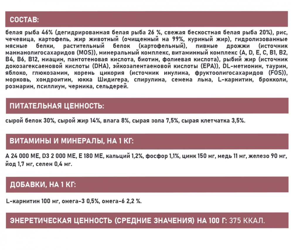 СОСТАВ: белая рыба 46% (дегидрированная белая рыба 26 %, свежая бескостная белая рыба 20%), рис, чечевица, картофель, жир животный (очищенный на 99%, куриный жир), гидролизованные мясные белки, растительный белок (картофельный), пивные дрожжи (источник маннанолигосахаридов (MOS)), минеральный комплекс, витаминный комплекс (A, D, E, С, В1, В2, В4, B6, В12, ниацин, пантотеновая кислота, биотин, фолиевая кислота), рыбий жир (источник докозагексаеновой кислоты (DHA), эйкозапентаеновой кислоты (EPA)), DL-метионин, таурин, яблоко, глюкозамин, корень цикория (источник инулина, фруктоолигосахаридов (FOS)), морковь, хондроитин, юкка Шидигера, спирулина, семена льна, L-карнитин, брокколи, розмарин, псиллиум, черника, сельдерей.
