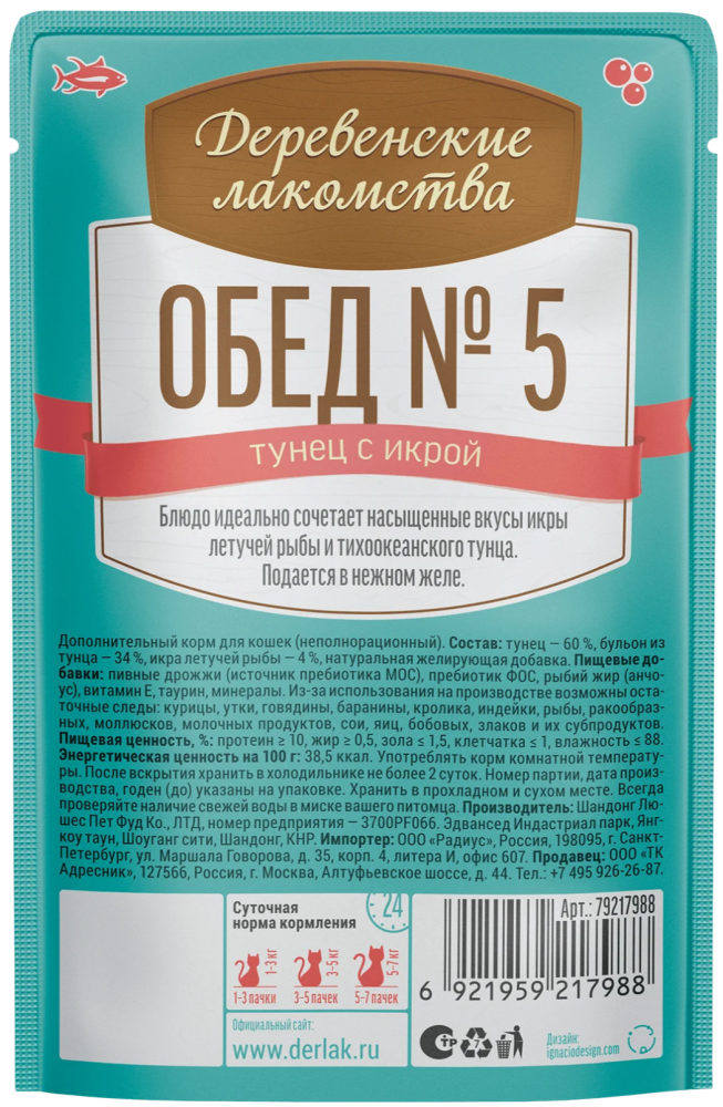 Консервированный влажный корм для кошек серии «Деревенские лакомства — Рыбные обеды» содержит большое количество мяса тихоокеанского тунца, которое идеально сочетается с насыщенным вкусом икры летучей рыбы. Подаётся в нежном желе, которое не только улучшает текстуру корма, но и способствует лучшему усвоению питательных веществ. Дополнительный (неполнорационный) корм для кошек Состав: тунец 60 %, бульон из тунца 34 %, икра летучей рыбы 4 %, натуральная желирующая добавка. Пищевая ценность, %: протеин — 10, жиры — 0,5, клетчатка — 1, зола — 1,5, влажность — 88. Пищевые добавки: пивные дрожжи (источник пребиотика МОС), пребиотик ФОС, рыбий жир (анчоус), витамин Е, таурин, минералы. Энергетическая ценность: 38,5 ккал / 100 г Подробнее