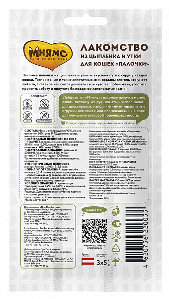 Мнямс лакомые палочки 13,5 см для кошек с цыпленком и уткой 3х5 г.