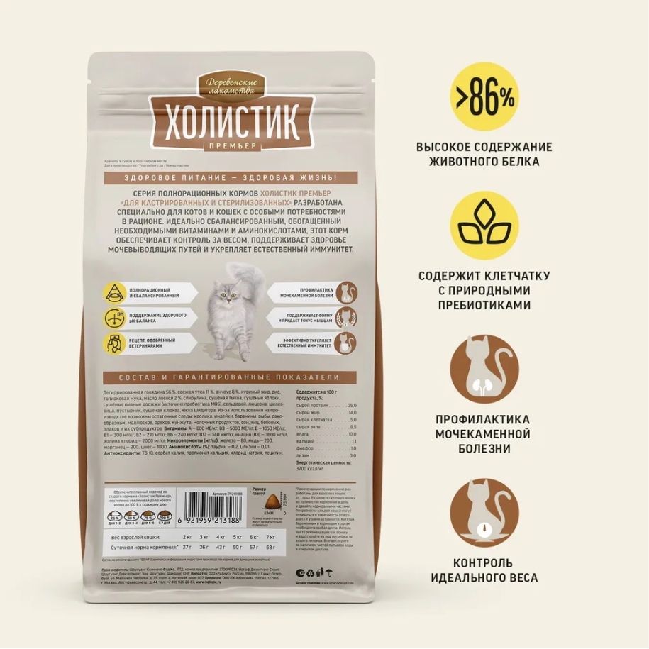 Сбалансированный, натуральный, полнорационный корм «Деревенские лакомства Холистик Премьер» обеспечивает питомцев всем необходимым для поддержания здоровья на каждом этапе жизни. В уникальных рецептах учтены не только вкусовые предпочтения кошек, но и их физиологические особенности, уровень активности и возраст.