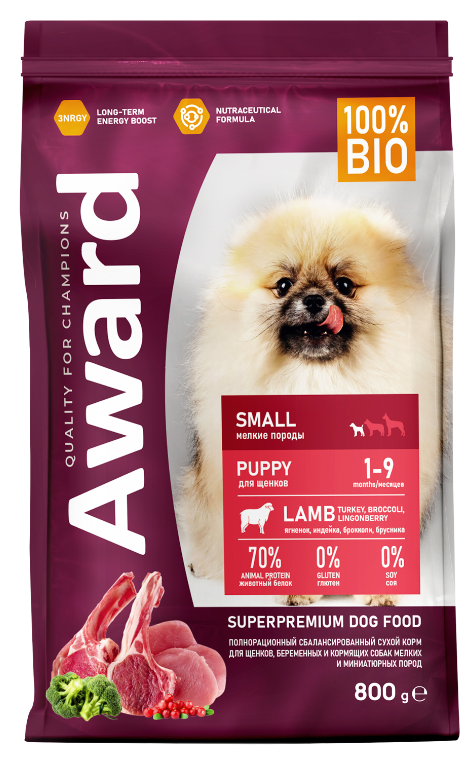 Сухой корм AWARD для щенков от 1 мес, беременных и кормящих сук мелких и мин. пород с ягненком и индейкой с добавлением брокколи и брусники